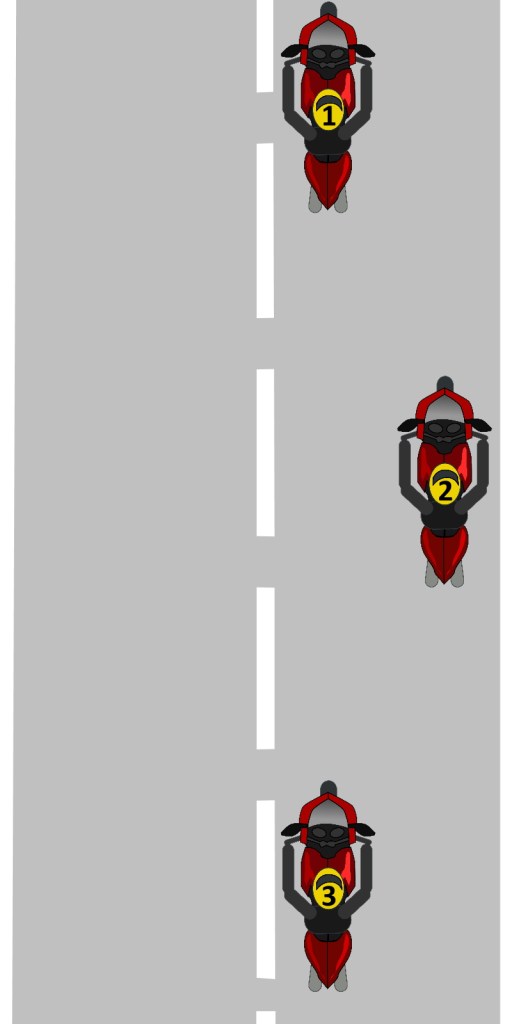 Ab zwei Motorrädern fahren wir seitlich versetzt. Der Erste in der Kolonne fährt links außen, der Zweite rechts außen, der Dritte wieder links außen und so weiter. Die Kolonne auf der linken Seite beginnen zu lassen macht deshalb Sinn, weil es dem führenden Motorrad beim Vorbereiten eines Überholvorgangs einen besser Überblick bietet und er generell eine bessere Übersicht über den Verkehr hat. Der große Vorteil beim versetzt fahren: Jeder Fahrer hat einen besseren Überblick über die Verkehrssituation und es entschärft es viele Situationen, da man an dem vorausfahrenden Motorrad, im Falle eines Falles, vorbeifahren kann, ohne dass man ausweichen muss. Wichtig: die Position in der Gruppe halten!