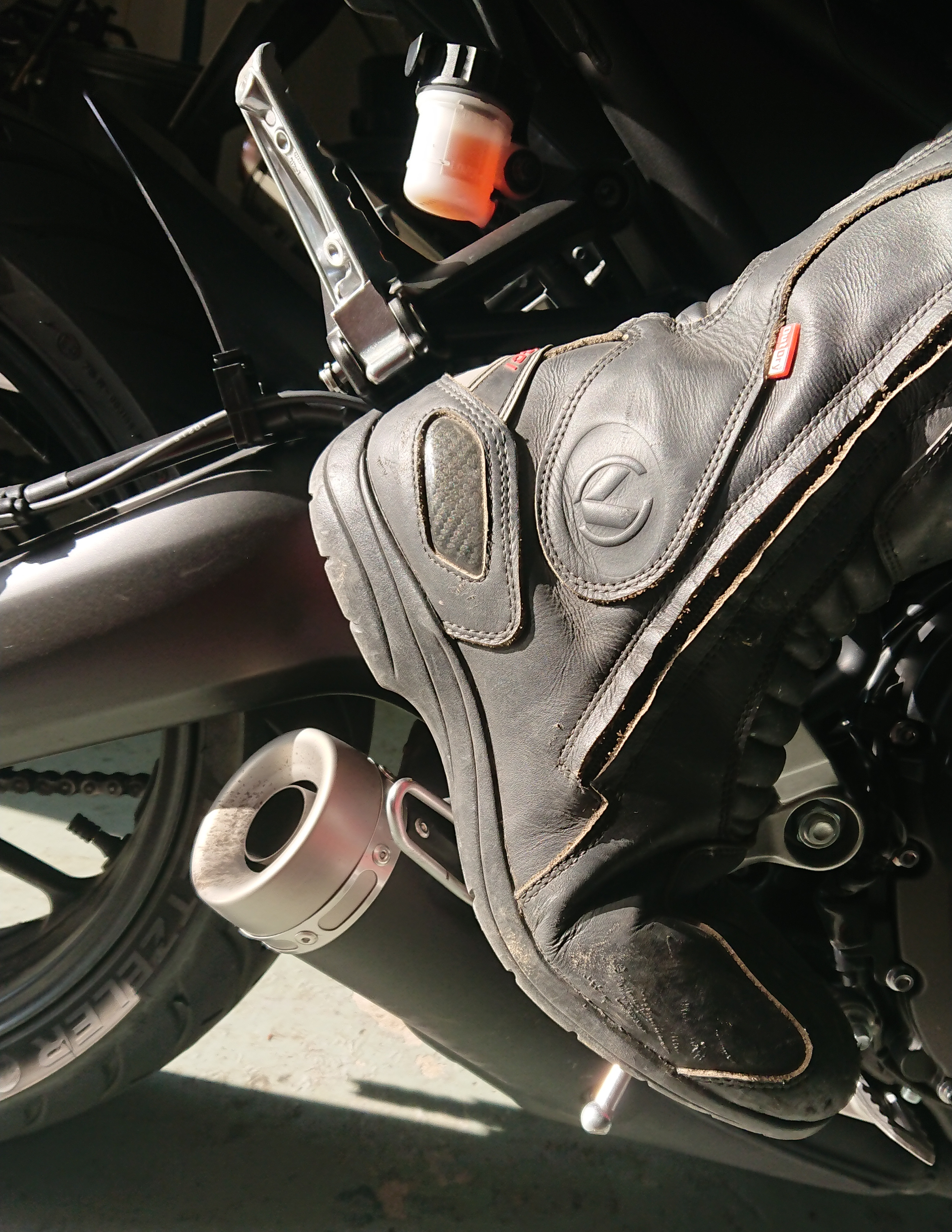 Ich lebe auf großem Fuß. Unter Schuhgröße 45 geht nichts und auch kleine Kindersärge passen mir wie angegossen. Auf den Rasten stehe ich mit den Fußballen, sogar noch nen Schnuff Richtung Zehen. Da kommen mir schon mal die Soziusrasten bzw. deren Ausleger in die Quere. Klar, man könnte die Dinger abschrauben, aber wenn man in eine sehr motivierte Polizeikontrolle gerät, und das Motorrad als Zweisitzer eingetragen ist, kommt man in Erklärungsnot.