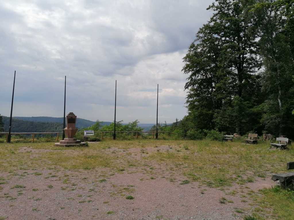 Wir biegen Richtung Heigenbrücken ab, und kommen auch schon zum nächsten Punkt (Via Punkt 4) bei dem ein kurzer Stopp durchaus lohnt. Die Gedenkstätte Pollasch, mit einem fabelhaften Ausblick Richtung Westen über den Spessart.
