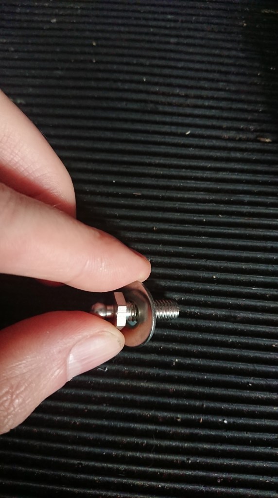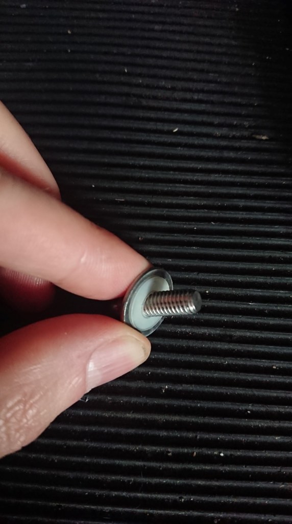 Damit mir die schicke Alu-Blende nicht zerkratzt (die Dinger kosten neu jeweils über 100€, da kriegt man schon mal ne amtliche Schnappatmung) habe ich die kleinen Kunststoffscheiben der originalen Schrauben einfach wieder mit benutzt und mit einer Unterlegscheibe ergänzt.