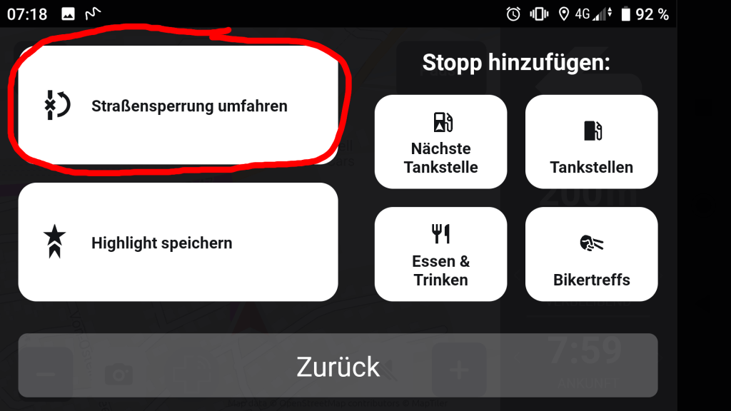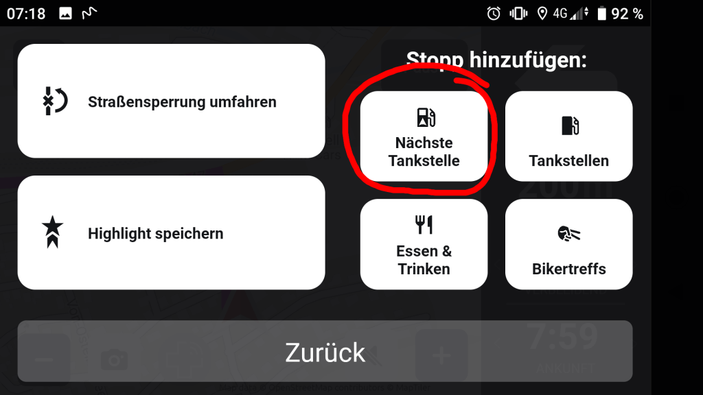 Dass man aus dem Quick-Menü einfach Tankstellen in die Route integrieren kann, ist auch eine Funktion, die es damals noch nicht gab. Und wenn man ein Motorrad mit einem etwas kleineren Tank hat, ist man darüber auch sehr froh. Allerdings gibt es den ein oder anderen Schockmoment: als ich dieses Jahr durchs Sauerland gefahren bin und schon 10 km auf Reserve war (ab 35 km auf Reserve fange ich das Schwitzen an, ab 45 km auf Reserve kann man dann schieben), dachte ich mir: „wählste mal die nächste verfügbare Tankstelle über das Quick-Menü aus“. Es hat mir auch eine Tankstelle ausgesucht, allerdings lag die 40 km entfernt und war in der entgegengesetzten Richtung. Also anhalten, kurz das Tankstellenmenü geöffnet und siehe da: Es waren noch einige weitere Tankstellen im näheren Umkreis und sogar eine in 10 km Entfernung, die direkt auf der Route lag. So richtig 100 % rund funktioniert es also noch nicht, ist aber meckern auf hohem Niveau.