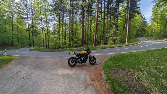 Sicherheitstechnisch natürlich fragwürdig, da eine in dieser Pose eingeschlagene Richtung nur mit erhöhtem Zeitaufwand zu korrigieren ist. Aber in der Praxis spielt das eine untergeordnete Rolle, denn in der speziell für dieses Vorhaben ausgesuchten Kurve (in den Knieschleifer-Kreisen sprechen sich solche Spots natürlich herum) herrschen quasi Laborbedienungen. Gut einsehbar, Streckenverlauf bekannt, guter Asphalt und wenn man noch ein paar gute Bekannte dabei hat, wird sogar vor Gegenverkehr gewarnt.
