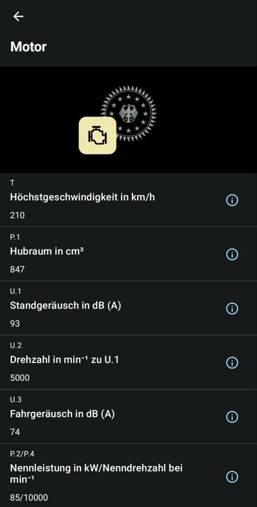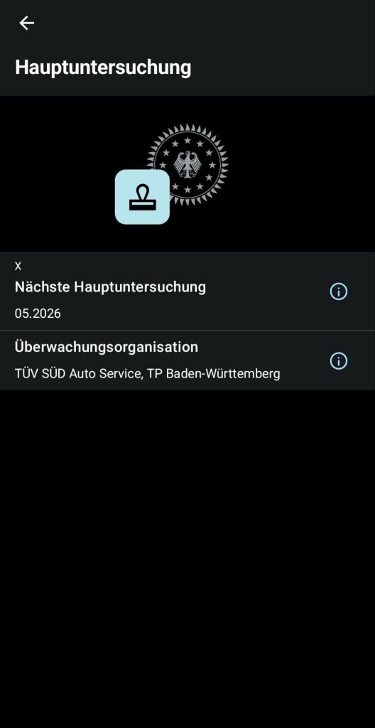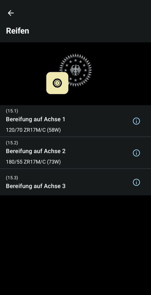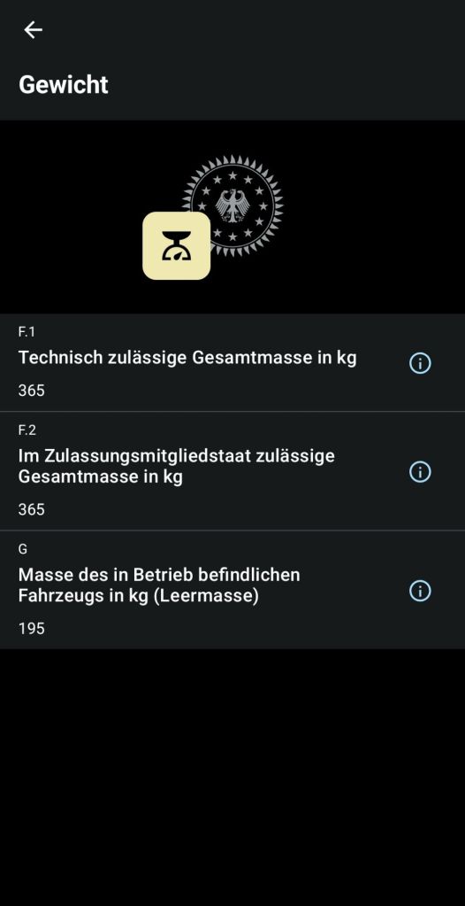 Und dann hat man auch wirklich alle Daten auf seinem Smartphone. Schon gegliedert und einfach zu finden. Fahrzeuggewicht, Kraftstoffart, maximales Gewicht, Motordaten, Bereifung, wann die nächste Hauptuntersuchung nötigt ist (inklusive Erinnerungsfunktion) usw.