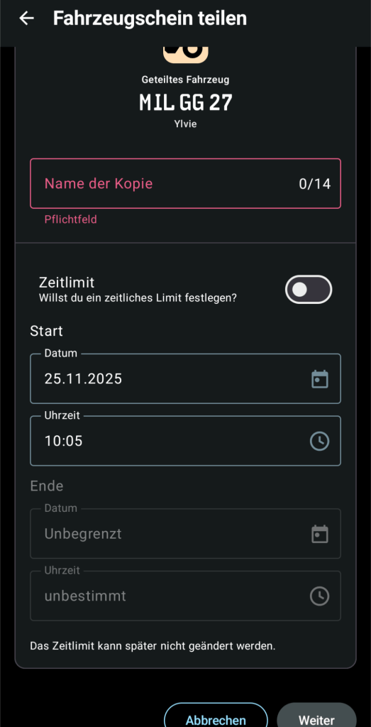 Eine weitere Funktion ist, dass man den Kfz-Schein digital weitergeben kann. Das ist z. B. praktisch, wenn man sein Fahrzeug verleiht. Hier kann auch eine befristete Zeit für die Weitergabe eingestellt werden.